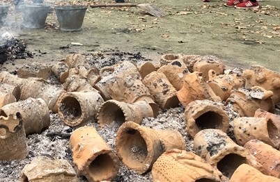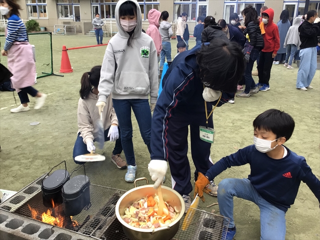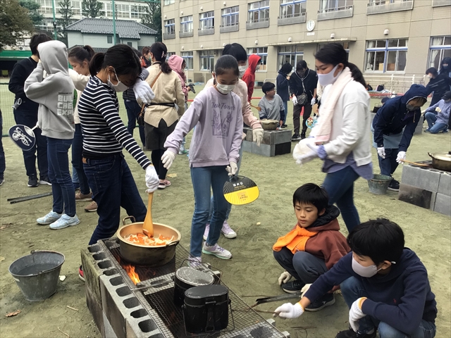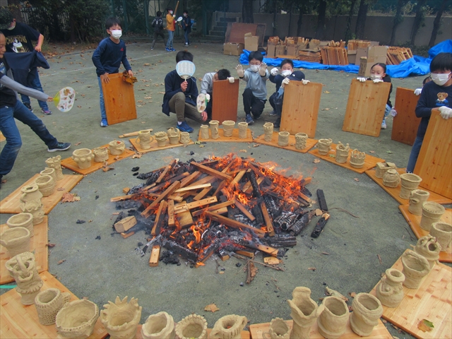 トキワ松だより 2022/11/29 6年図工 縄文土器をつくろう 毎年秋に校庭で野焼きをします。6年生が図工の授業でつくった土器を、本物の炎の熱で焼成する、焼き物の原点を体験する授業です。 作品は1学期のうちに制作をして、長い時間をかけてよく乾燥させておきます。 たき火を中心にして、その周りに土器を並べ、土器の温度をゆっくりあげていきます。 熾火の上でさらに土器を温めた後、気をくべてどんどん温度を上げていきます。 木が燃え尽きて、灰の中から土器が姿を見せてきました。大きな破損なども無く、きれいに焼けたようです。 今年は、野焼きと同時進行で、飯盒炊爨も行いました。 自分たちでつくったカレーは格別です! おまけ。3時のおやつに焼き芋です♪ (図工科)